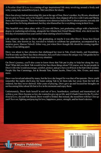 A Peculiar Kind Of Love is a coming-of-age inspirational life story revolving around a lively and witty young lady named Drewlynn L. McCain (Drew for short). Drew has always had an interesting life; just at the age of four, Drew's mother, Joy Rivers, abandoned her at a pier in Texas, only to be found by some locals, then shipped off to live with Curtis and Shelia Jones, her foster parents. These two humans were almost as bad as Drew's absent parents; not only did they mock her for being abandoned, but they also blamed her for everything wrong in their lives. This heartfelt story takes place with a 22-year-old Drew, just graduating college with a bachelor's degree in marketing/advertising, alongside her Atlanta best friend Shantel Reid, who she'd met the first day of orientation four years earlier when starting school in Atlanta. Life started to wake up for Drew after graduating, or maybe it was after Drew's Texas best friend Jenius Tate, also known as Jay, traveled to Atlanta to celebrate her graduation, accompanied by a surprise guest, Marcus Tidwell. Either way, just when Drew thought life should be coming together for her, it was falling apart. Drew was about to face obstacles that challenged her trust in Yah, (God) family, and friendships. You'll not only see Drew face these obstacles, but you'll also witness the unique way Yah guides her to overcome them and be the victor in every situation. On Drew's journey, you'll also come to know those that Yah put in play to help her along the way. Wait! What did you think Yah would let her face these things alone? Of course, not; he put people in Drew's life who would encourage, comfort, protect, and give her a swift kick in the butt when needed. People like Sue Cummings, Joe & Brenda Tate, Rainn Jacobs, Dina Cole, Mrs. Evens, and many more. Drew was loved and adored by many, but the love she longed for was that of her parents. Drew could remember the nights she'd pray for hours asking Yah to let them take her away from the hell she endured, but they never showed. After years of praying, Drew gave up and focused her thoughts on not becoming bitter about life but to live in the moments and enjoy them. Unfortunately, Drew finds herself in and out of love, heartbroken, confused, and traumatized, all within a year. Drew became so low she wanted to give up on life, and if it hadn't been for the Peculiar Kind of Love, she and Yah shared, Drew would've folded. But instead, she stood firm with her Chin up and Chest out, fighting and praying for love, happiness, peace, strength, and her heart's desires.