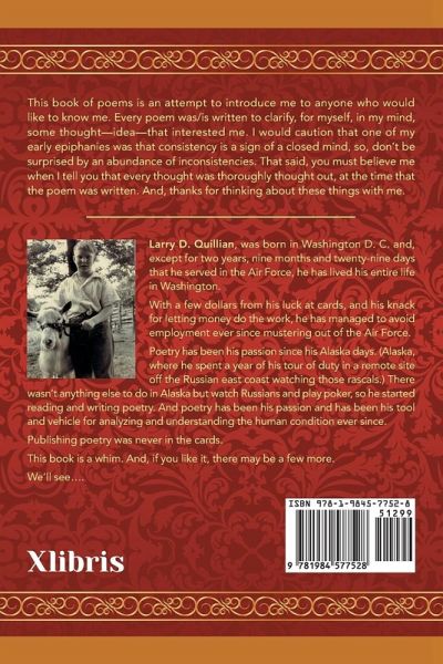This book of poems is an attempt to introduce me to anyone who would like to know me. Every poem was/is written to clarify, for myself, in my mind, some thought-idea-that interested me. I would caution that one of my early epiphanies was that consistency is a sign of a closed mind, so, don't be surprised by an abundance of inconsistencies. That said, you must believe me when I tell you that every thought was thoroughly thought out, at the time that the poem was written. And, thanks for thinking about these things with me.