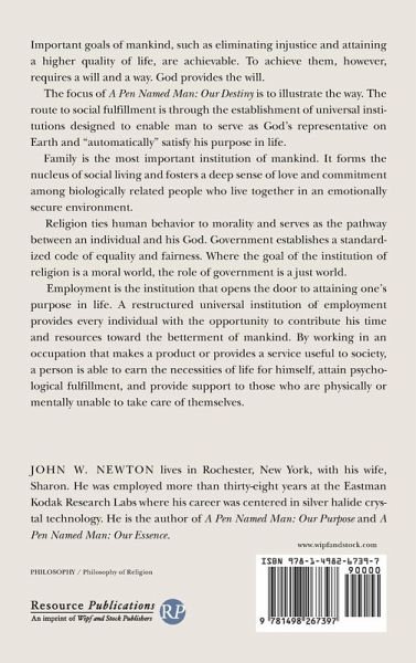 Important goals of mankind, such as eliminating injustice and attaining a higher quality of life, are achievable. To achieve them, however, requires a will and a way. God provides the will. The focus of A Pen Named Man: Our Destiny is to illustrate the way. The route to social fulfillment is through the establishment of universal institutions designed to enable man to serve as God's representative on Earth and ""automatically"" satisfy his purpose in life. Family is the most important institution of mankind. It forms the nucleus of social living and fosters a deep sense of love and commitment among biologically related people who live together in an emotionally secure environment. Religion ties human behavior to morality and serves as the pathway between an individual and his God. Government establishes a standardized code of equality and fairness. Where the goal of the institution of religion is a moral world, the role of government is a just world. Employment is the institution that opens the door to attaining one's purpose in life. A restructured universal institution of employment provides every individual with the opportunity to contribute his time and resources toward the betterment of mankind. By working in an occupation that makes a product or provides a service useful to society, a person is able to earn the necessities of life for himself, attain psychological fulfillment, and provide support to those who are physically or mentally unable to take care of themselves.