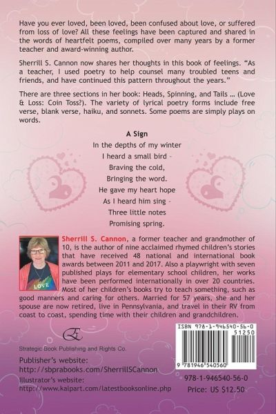 Have you ever loved, been loved, been confused about love, or suffered from loss of love? All these feelings have been captured and shared in the words of heartfelt poems, compiled over many years by a former teacher and award-winning author. Sherrill S. Cannon now shares her thoughts in this book of feelings. "As a teacher, I used poetry to help counsel many troubled teens and friends, and have continued this pattern throughout the years." There are three sections in her book: Heads, Spinning, and Tails ... (Love & Loss: Coin Toss?). The variety of lyrical poetry forms include free verse, blank verse, haiku, and sonnets. Some poems are simply plays on words. A Sign In the depths of my winter I heard a small bird - Braving the cold, Bringing the word. He gave my heart hope As I heard him sing - Three little notes Promising spring. Sherrill S. Cannon, a former teacher and grandmother of 10, is the author of nine acclaimed rhymed children's stories that have received 48 national and international book awards between 2011 and 2017. Also a playwright with seven published plays for elementary school children, her works have been performed internationally in over 20 countries. Most of her children's books try to teach something, such as good manners and caring for others. Married for 57 years, she and her spouse are now retired, live in Pennsylvania, and travel in their RV from coast to coast, spending time with their children and grandchildren.