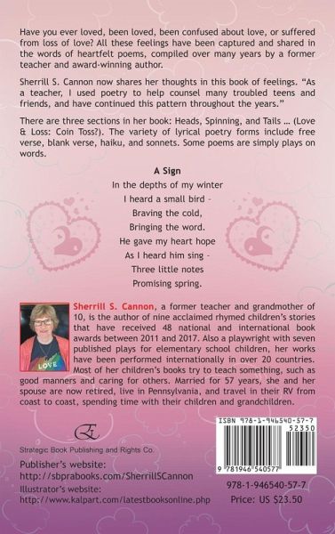 Have you ever loved, been loved, been confused about love, or suffered from loss of love? All these feelings have been captured and shared in the words of heartfelt poems, compiled over many years by a former teacher and award-winning author. Sherrill S. Cannon now shares her thoughts in this book of feelings. "As a teacher, I used poetry to help counsel many troubled teens and friends, and have continued this pattern throughout the years." There are three sections in her book: Heads, Spinning, and Tails … (Love & Loss: Coin Toss?). The variety of lyrical poetry forms include free verse, blank verse, haiku, and sonnets. Some poems are simply plays on words. A Sign In the depths of my winter I heard a small bird - Braving the cold, Bringing the word. He gave my heart hope As I heard him sing - Three little notes Promising spring. Sherrill S. Cannon, a former teacher and grandmother of 10, is the author of nine acclaimed rhymed children's stories that have received 48 national and international book awards between 2011 and 2017. Also a playwright with seven published plays for elementary school children, her works have been performed internationally in over 20 countries. Most of her children's books try to teach something, such as good manners and caring for others. Married for 57 years, she and her spouse are now retired, live in Pennsylvania, and travel in their RV from coast to coast, spending time with their children and grandchildren. Publisher's website: http://sbprabooks.com/SherrillSCannon