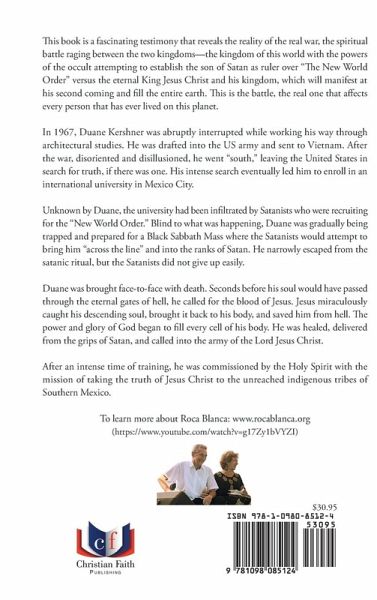 This book is a fascinating testimony that reveals the reality of the real war, the spiritual battle raging between the two kingdoms-the kingdom of this world with the powers of the occult attempting to establish the son of Satan as ruler over "The New World Order" versus the eternal King Jesus Christ and his kingdom, which will manifest at his second coming and fill the entire earth. This is the battle, the real one that affects every person that has ever lived on this planet. In 1967, Duane Kershner was abruptly interrupted while working his way through architectural studies. He was drafted into the US army and sent to Vietnam. After the war, disoriented and disillusioned, he went "south," leaving the United States in search for truth, if there was one. His intense search eventually led him to enroll in an international university in Mexico City. Unknown by Duane, the university had been infiltrated by Satanists who were recruiting for the "New World Order." Blind to what was happening, Duane was gradually being trapped and prepared for a Black Sabbath Mass where the Satanists would attempt to bring him "across the line" and into the ranks of Satan. He narrowly escaped from the satanic ritual, but the Satanists did not give up easily. Duane was brought face-to-face with death. Seconds before his soul would have passed through the eternal gates of hell, he called for the blood of Jesus. Jesus miraculously caught his descending soul, brought it back to his body, and saved him from hell. The power and glory of God began to fill every cell of his body. He was healed, delivered from the grips of Satan, and called into the army of the Lord Jesus Christ. After an intense time of training, he was commissioned by the Holy Spirit with the mission of taking the truth of Jesus Christ to the unreached indigenous tribes of Southern Mexico. To learn more about Roca Blanca: www.rocablanca.org (https://www.youtube.com/watch?v=g17Zy1bVYZI)