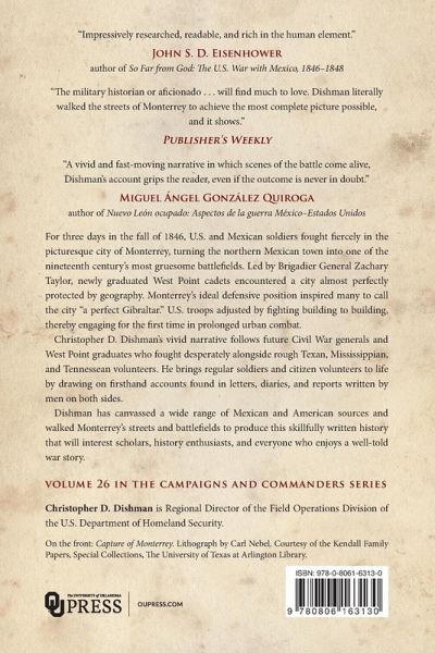 For three days in the fall of 1846, U.S. and Mexican soldiers fought fiercely in the picturesque city of Monterrey, turning the northern Mexican town, known for its towering mountains and luxurious gardens, into one of the nineteenth century's most gruesome battlefields. Led by Brigadier General Zachary Taylor, graduates of the U.S. Military Academy encountered a city almost perfectly protected by mountains, a river, and a vast plain. Monterrey's ideal defensive position inspired more than one U.S. soldier to call the city "a perfect Gibraltar." The first day of fighting was deadly for the Americans, especially the newly graduated West Point cadets. But they soon adjusted their tactics and began fighting building to building. Chris D. Dishman conveys in a vivid narrative the intensity and drama of the Battle of Monterrey, which marked the first time U.S. troops engaged in prolonged urban combat. Future Civil War generals and West Point graduates fought desperately alongside rough Texan, Mississippian, and Tennessean volunteers. General Taylor engineered one of the army's first wars of maneuver at Monterrey by sending the bulk of his troops against the weakest part of the city, and embedded press reporters wrote eyewitness accounts of the action for readers back in the States. Dishman interweaves descriptions of troop maneuvers and clashes between units using pistols and rifles with accounts of hand-to-hand combat involving edged weapons, stones, clubs, and bare hands. He brings regular soldiers and citizen volunteers to life in personal vignettes that draw on firsthand accounts from letters, diaries, and reports written by men on both sides. An epilogue carries the narrative thread to the conclusion of the war. Dishman has canvassed a wide range of Mexican and American sources and walked Monterrey's streets and battlefields. Accompanied by maps and period illustrations, this skillfully written history will interest scholars, history enthusiasts, and everyone who enjoys a true war story well told.