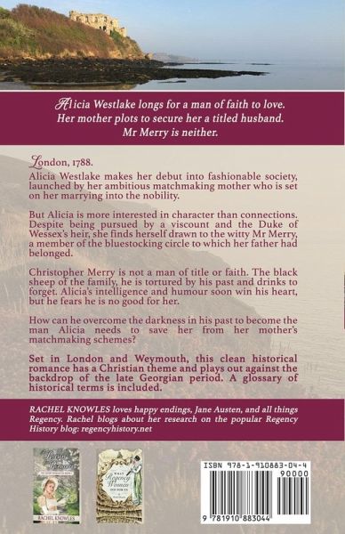 Alicia Westlake longs for a man of faith to love. Her mother plots to secure her a titled husband. Mr Merry is neither. London, 1788. Alicia Westlake makes her debut into fashionable society, launched by her ambitious matchmaking mother who is set on her marrying into the nobility. But Alicia is more interested in character than connections. Despite being pursued by a viscount and the Duke of Wessex's heir, she finds herself drawn to the witty Mr Merry - a member of the bluestocking circle to which her father had belonged. Christopher Merry is not a man of title or faith. The black sheep of the family, he is tortured by his past and drinks to forget. Alicia's intelligence and humour soon win his heart, but he fears he is no good for her. How can he overcome the darkness in his past to become the man Alicia needs to save her from her mother's matchmaking schemes? Set in London and Weymouth, this clean historical romance has a Christian theme and plays out against the backdrop of the late Georgian period. A glossary of historical terms is included.