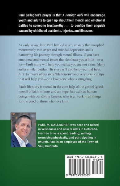 Paul M. Gallagher wrote A Perfect Walk to encourage youth and adults to open up about their mental and emotional battles to someone trustworthy . . . to confide their anguish caused by childhood accidents, injuries, illnesses, etc. As early as age four, Paul battled severe anxiety that morphed monstrously into anger and suicidal depression. If you have emotional and mental issues that debilitate you a little-or a lot-Paul's story will help you realize you are not alone. Many suffer similar battles. His story will also help you find help. He wrote A Perfect Walk, his harrowing life journey through mental illness, with two audiences in mind. First, our youth, ages twelve to seventeen-"the crucial years"-who are battling mental health concerns including anger, anxiety, and depression. He also hopes to help their parents, guardians, teachers, and other youth leaders recognize the signs of mental illness early. He desires that our youth have the courage and safe spaces to discuss truthfully their thought processes and feelings with those who are trustworthy before anger, anxiety and depression results in debilitation and harm that steals joy from them in everyday life and negatively impacts others. His second audience is adults who did not receive the mental health help they needed as a young person. As an invaluable preventative offering, Paul shares with transparency and in-depth honesty his life story, hoping to prevent youth and adults from making the same mistakes he did well into his adulthood. His heart and mission are to help prevent and address anger and severe anxiety issues, depression, and other serious mental health issues, to help "nip 'em in the bud"-before the grave concerns become debilitating. A Perfect Walk offers sixty "life lessons" and very practical tips that will help you-or a loved one who is struggling. Recommendations include youth and adult sports participation, which facilitates respect, teamwork, communication, accountability, sportsmanship, lessons learned from winning (humbly with class) and losing (an opportunity to learn and improve), and self-identity. Paul's life story is rooted in the core help of the Gospel (good news!) of faith in Christ Jesus and an imperfect walk as human beings with our divine Creator who is at work in all things for the good of those who love Him.
