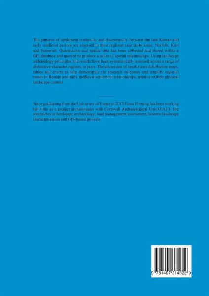 This is a publication of my doctoral thesis with the University of Exeter. My research aim has been to assess patterns of settlement continuity and discontinuity between the late Roman and early medieval periods over three regional case study areas: Norfolk, Kent and Somerset. Quantitative and spatial data has been collected and stored within a GIS database and queried to produce a series of spatial relationships. Using landscape archaeology principles the results have been systematically assessed across a range of distinctive character regions, or pays. The discussion of results uses distribution maps, tables and charts to help demonstrate the research outcomes and amplify regional trends in Roman and early medieval settlement relationships, relative to their physical landscape context.