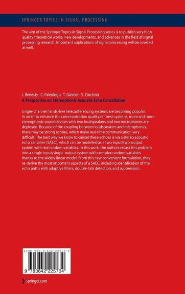 Introduction.- Problem Formulation.- System Identification with the Wiener Filter.- A Class of Stochastic Adaptive Filters.- A Class of Affine Projection Algorithms.- Recursive Least-Squares Algorithms.- Double-Talk Detection.- Echo and Noise Suppression as a Binaural Noise Reduction Problem.- Experimental Study.
