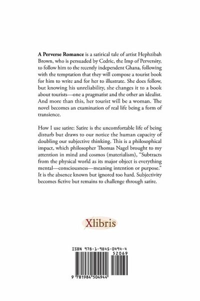 A Perverse Romance is a satirical tale of artist Hephzibah Brown, who is persuaded by Cedric, the Imp of Perversity, to follow him to the recently independent Ghana, following with the temptation that they will compose a tourist book for him to write and for her to illustrate. She does follow, but knowing his unreliability, she changes it to a book about tourists-one a pragmatist and the other an idealist. And more than this, her tourist will be a woman. The novel becomes an examination of real life being a form of transience. How I use satire: Satire is the uncomfortable life of being disturb but draws to our notice the human capacity of doubling our subjective thinking. This is a philosophical impact, which philosopher Thomas Nagel brought to my attention in mind and cosmos (materialism), "Subtracts from the physical world as its major object is everything mental-consciousness-meaning intention or purpose." It is the absence known but ignored too hard. Subjectivity becomes fictive but remains to challenge through satire.