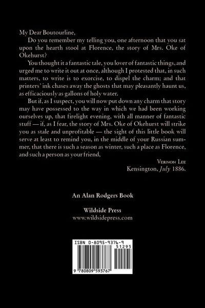 My Dear Boutourline, Do you remember my telling you, one afternoon that you sat upon the hearth stool at Florence, the story of Mrs. Oke of Okehurst? You thought it a fantastic tale, you lover of fantastic things, and urged me to write it out at once, although I protested that, in such matters, to write is to exorcise, to dispel the charm; and that printers' ink chases away the ghosts that may pleasantly haunt us, as efficaciously as gallons of holy water. But if, as I suspect, you will now put down any charm that story may have possessed to the way in which we had been working ourselves up, that firelight evening, with all manner of fantastic stuff -- if, as I fear, the story of Mrs. Oke of Okehurst will strike you as stale and unprofitable -- the sight of this little book will serve at least to remind you, in the middle of your Russian summer, that there is such a season as winter, such a place as Florence and such a person as your friend, Vernon Lee, Kensington, July, 1886.