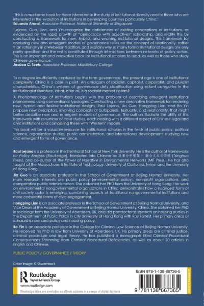 To a degree insufficiently captured by the term governance, the present age is one of institutional complexity. China is a case in point. An amalgam of socialist, capitalist, corporatist, and pluralist characteristics, China's systems of governance defy classification using extant categories in the institutionalist literature. What, after all, is a socialist market system? A Phenomenology of Institutions begins with the problem of describing emergent institutional phenomena using conventional typologies. Constructing a new descriptive framework for rendering new, hybrid, and flexible institutional designs, Raul Lejano, Jia Guo, Hongping Lian, and Bo Yin propose new descriptors, involving concepts of autopoeisis, textuality, and relationality, that might better describe new and emergent models of governance. The authors illustrate the utility of this framework with a number of case studies, each dealing with a different aspect of Chinese legal and civic institutions and comparing these with 'Western' models. This book will be a valuable resource for institutional scholars in the fields of public policy, political science, organization studies, public administration, and international development, studying new and emergent forms of governance.