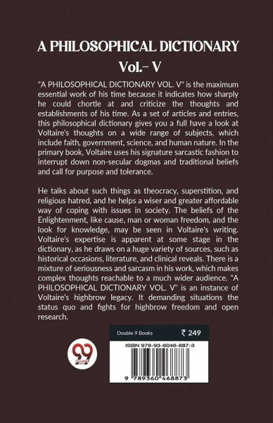 "A PHILOSOPHICAL DICTIONARY VOL. V" is the maximum essential work of his time because it indicates how sharply he could chortle at and criticize the thoughts and establishments of his time. As a set of articles and entries, this philosophical dictionary gives you a full have a look at Voltaire's thoughts on a wide range of subjects, which include faith, government, science, and human nature. In the primary book, Voltaire uses his signature sarcastic fashion to interrupt down non-secular dogmas and traditional beliefs and call for purpose and tolerance. He talks about such things as theocracy,…mehr