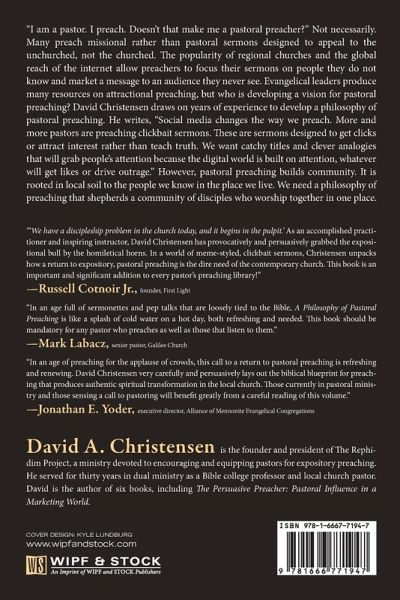 ""I am a pastor. I preach. Doesn't that make me a pastoral preacher?"" Not necessarily. Many preach missional rather than pastoral sermons designed to appeal to the unchurched, not the churched. The popularity of regional churches and the global reach of the internet allow preachers to focus their sermons on people they do not know and market a message to an audience they never see. Evangelical leaders produce many resources on attractional preaching, but who is developing a vision for pastoral preaching? David Christensen draws on years of experience to develop a philosophy of pastoral preaching. He writes, ""Social media changes the way we preach. More and more pastors are preaching clickbait sermons. These are sermons designed to get clicks or attract interest rather than teach truth. We want catchy titles and clever analogies that will grab people's attention because the digital world is built on attention, whatever will get likes or drive outrage."" However, pastoral preaching builds community. It is rooted in local soil to the people we know in the place we live. We need a philosophy of preaching that shepherds a community of disciples who worship together in one place.