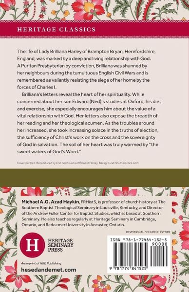 The life of Lady Brilliana Harley of Brampton Bryan, Herefordshire, England, was marked by a deep and living relationship with God. A Puritan Presbyterian by conviction, Brilliana was shunned by her neighbours during the tumultuous English Civil Wars and is remembered as valiantly resisting the siege of her home by the forces of Charles I. Brilliana's letters reveal the heart of her spirituality. While concerned about her son Edward (Ned)'s studies at Oxford, his diet and exercise, she especially encourages him about the value of a vital relationship with God. Her letters also expose the breadth of her reading and her theological acumen. As the troubles around her increased, she took increasing solace in the truths of election, the sufficiency of Christ's work on the cross and the sovereignty of God in salvation. The soil of her heart was truly warmed by "the sweet waters of God's Word."