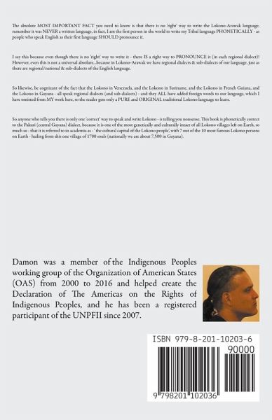 The absolute MOST IMPORTANT FACT you need to know is that there is no 'right' way to write the Lokono-Arawak language, remember it was NEVER a written language, in fact, I am the first person in the world to write my Tribal language PHONETICALLY - as people who speak English as their first language SHOULD pronounce it. I say this because even though there is no 'right' way to write it - there IS a right way to PRONOUNCE it (in each regional dialect)! However, even this is not a universal absolute...because in Lokono-Arawak we have regional dialects & sub-dialects of our language, just as there are regional/national & sub-dialects of the English language. So likewise, be cognizant of the fact that the Lokono in Venezuela, and the Lokono in Suriname, and the Lokono in French Guiana, and the Lokono in Guyana - all speak regional dialects (and sub-dialects) - and they ALL have added foreign words to our language, which I have omitted from MY work here, so the reader gets only a PURE and ORIGINAL traditional Lokono language to learn.