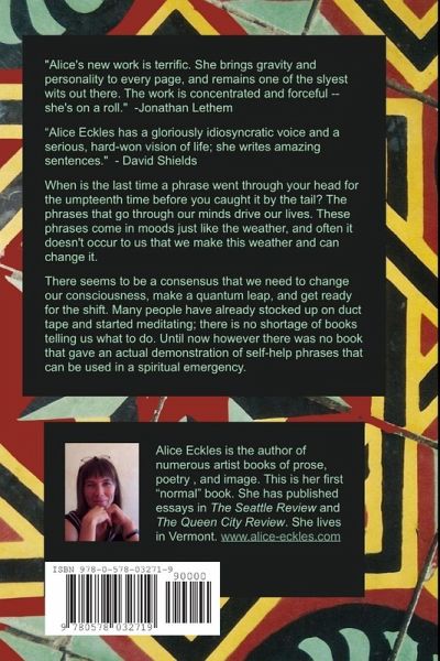 When is the last time a phrase went through your head for the umpteenth time before you caught it by the tail ? The phrases that go through our minds drive our lives. These phrases come in moods just like the weather, and often it doesn't occur to us that we make this weather and can change it. There seems to be a consensus that we need to change our consciousness, make a quatum leap, and get ready for the shift. Many people have already stocked up on duct tape and started meditating; there is no shortage of books telling us what to do. Until now however there was no book that gave an actual demonstration of self-help phrases that can be used in a spiritual emergency. Please enjoy this collection of personal essays---"Alice's new work is terrific. She brings gravity and personality to every page, and remains one of the slyest wits out there. The work is concentrated and forceful -- she's on a roll." -Jonathan Lethem.