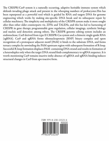 The CRISPR/Cas9 system is a naturally occurring, adaptive heritable immune system which defends invading phage attack and present in the whooping numbers of prokaryotes.This has been repurposed as a powerful tool which is guided by RNA and targets DNA for genome engineering which works by making site-specific DNA break and its subsequent repair by cellular machinery. The simplicity and multiplexity of the CRISPR system make it more sought after than other older counterparts viz. ZFNs and TALENs, and this has led to harnessing of CRISPR in gene therapy programmable gene regulation, cellular imagings, synthetic biology and nucleic acid detection among others. The CRISPR genome editing system includes an endonuclease, Cas9 derived from type II CRISPR-Cas system and a chimeric single-guide RNA (sgRNA). Cas9 and sgRNA forms ribonucleoprotein (RNP) binary complex and upon recognition of a protospacer adjacent motif (PAM) it binds to the substrate DNA, and forms ternary complex by unwinding the PAM upstream region with subsequent formation of R-loop. Successful R-loop formation displaces PAM- containing DNA strand and results in formation of a heteroduplex only when the target DNA strand finds complementary to sgRNA sequence. It is worth mentioning Cas9 remains inactive inthe absence of sgRNA and sgRNA binding induces structural changes in Cas9 from apo toactive form.