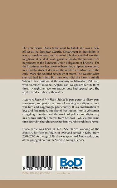The year before Diana Janse went to Kabul, she was a desk officer at the European Security Department in Stockholm. It was an unglamorous and stressful job that entailed workinglong hours at her desk, writing instructions for the government's negotiators at the European Union delegation in Brussels. For the first time since her dream of becoming a diplomat was born, in a shabby student dorm on the outskirts of Moscow in the early 1990s, she doubted her choice of career. This was not what she had had in mind. But then what did she have in mind?When a new position at the embassy in Islamabad, Pakistan, with placement in Kabul, Afghanistan, was posted for the third time, it caught her eye. An escape route had opened up... She applied and left shortly thereafter.I Leave A Piece of My Heart Behind is part personal diary, part travelogue, and part an account of working as a diplomat in a war-torn and staggeringly poor country. It is a proclamation of love and fascination, but also of frustration, from a Westerner struggling to understand the world of politics and diplomacy in a culture entirely different from her own - while at the same time defending her choices to her family and friends back home.