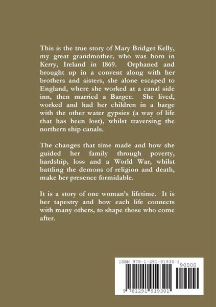 This is the true story of Mary Bridget Kelly, my great grandmother, who was born in Kerry, Ireland in 1869. Orphaned and brought up in a convent along with her brothers and sisters, she alone escaped to England, where she worked at a canal side inn, then married a Bargee. She lived, worked and had her children in a barge with the other water gypsies (a way of life that has been lost), whilst traversing the northern ship canals. The changes that time made and how she guided her family through poverty, hardship, loss and a World War, whilst battling the demons of religion and death, make her presence formidable. It is a story of one woman's lifetime. It is her tapestry and how each life connects with many others, to shape those who come after.