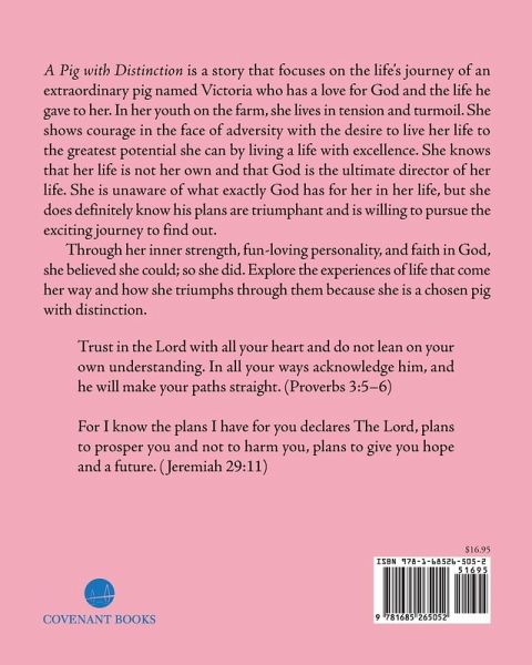 A Pig with Distinction is a story that focuses on the life's journey of an extraordinary pig named Victoria who has a love for God and the life he gave to her. In her youth on the farm, she lives in tension and turmoil. She shows courage in the face of adversity with the desire to live her life to the greatest potential she can by living a life with excellence. She knows that her life is not her own and that God is the ultimate director of her life. She is unaware of what exactly God has for her in her life, but she does definitely know his plans are triumphant and is willing to pursue the exciting journey to find out. Through her inner strength, fun-loving personality, and faith in God, she believed she could; so she did. Explore the experiences of life that come her way and how she triumphs through them because she is a chosen pig with distinction. Trust in the Lord with all your heart and do not lean on your own understanding. In all your ways acknowledge him, and he will make your paths straight. (Proverbs 3:5-6) For I know the plans I have for you declares The Lord, plans to prosper you and not to harm you, plans to give you hope and a future. (Jeremiah 29:11)
