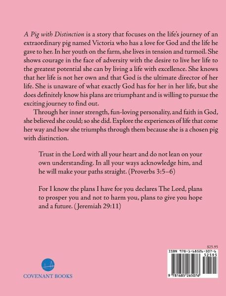 A Pig with Distinction is a story that focuses on the life's journey of an extraordinary pig named Victoria who has a love for God and the life he gave to her. In her youth on the farm, she lives in tension and turmoil. She shows courage in the face of adversity with the desire to live her life to the greatest potential she can by living a life with excellence. She knows that her life is not her own and that God is the ultimate director of her life. She is unaware of what exactly God has for her in her life, but she does definitely know his plans are triumphant and is willing to pursue the exciting journey to find out. Through her inner strength, fun-loving personality, and faith in God, she believed she could; so she did. Explore the experiences of life that come her way and how she triumphs through them because she is a chosen pig with distinction. Trust in the Lord with all your heart and do not lean on your own understanding. In all your ways acknowledge him, and he will make your paths straight. (Proverbs 3:5-6) For I know the plans I have for you declares The Lord, plans to prosper you and not to harm you, plans to give you hope and a future. (Jeremiah 29:11)