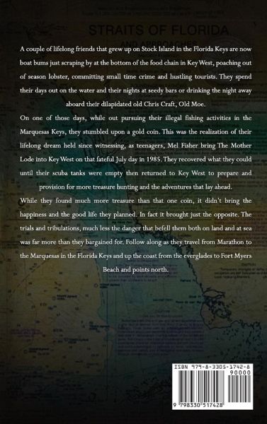 Lifelong friends that grew up in the Florida Keys, are now boat bums just scraping by at the bottom of the food chain, poaching lobster, committing small time crime and hustling tourists. They spend their days out on the water and their nights at seedy bars or drinking the night away aboard their dilapidated old Chris Craft, Old Moe. While out pursuing their illegal fishing activities in the Marquesas Keys, they stumbled upon a gold coin, realizing their lifelong dream. Held since witnessing Mel Fisher bring The Mother Lode into Key West on that fateful July day in 1985. They recovered what they could until their scuba tanks were empty, then returned to Key West to prepare for more treasure hunting and the adventures that lay ahead. Finding more treasure didn't bring the happiness and the good life they planned, just the opposite. The trials, tribulations and danger that befell them, both on land and at sea, was more than they bargained for. Join them on their voyage as they travel from Marathon to the Marquesas and up the coast from the everglades to Fort Myers Beach and destinations north.