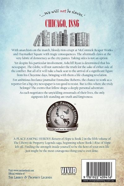 Chicago, 1886. With anarchists on the march, bloody riots erupt at McCormick Reaper Works and Haymarket Square with tragic consequences. The aftermath claws at the very fabric of democracy as the city panics. Taking sides is not an option. Yet despite his particular involvement, Ashcliff Ryan is determined that his newspaper, The Globe, will not surrender the truth for the sake of either side of the conflict. But all of it will take a back seat to the arrival of a significant figure from his Cheyenne days, bringing with them a life-changing revelation. For ambitious freelance journalist Emmaline Roberts, the chance to work as a reporter for a big city newspaper is too good to resist. But is this where she truly belongs? The events that follow shape a deeply personal adventure. As each negotiates the unyielding crossroads of their lives, the only signposts left standing are truth and forgiveness. A PLACE AMONG HEROES Return of Hope is Book 2 in the fifth volume of The Liberty & Property Legends saga, beginning where Book 1 Rise of Hope left off. Finding the strength inside yourself to be the hero of your own life just might be the most courageous thing you've ever done.