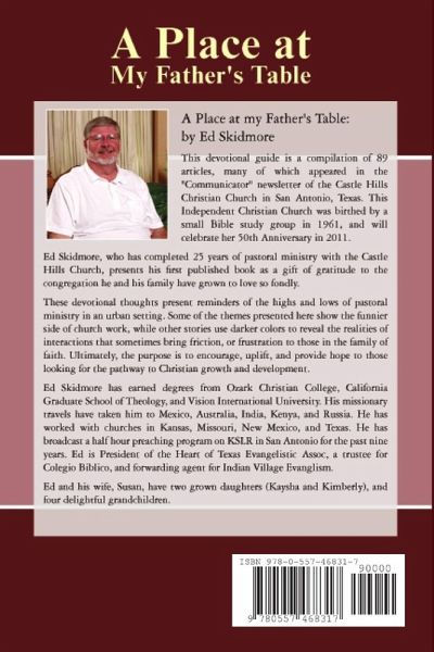 This devotional guide is designed to provide encouragement to the growing Christian, and is provided for morning or evening devotions. The short articles included were first printed in the "Communicator" newsletter of Castle Hills Christian Church, in San Antonio. They were printed from 1985 through 1997, and the final section of devotions first appeared in Ed Skidmore's internet blog in 2008 - 2010 (www.skiddingintohome.blogspot.net)