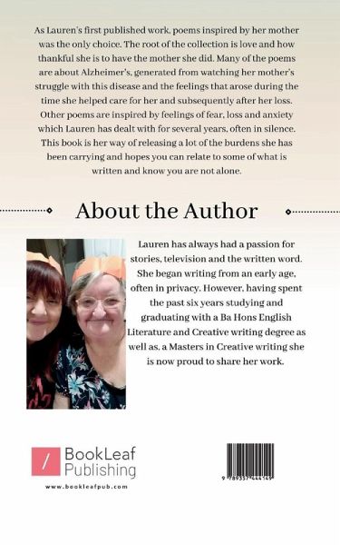 ""As Lauren's first published work, poems inspired by her mother was the only choice. The root of the collection is love and how thankful she is to have the mother she did. Many of the poems are about Alzheimer's, generated from watching her mother's struggle with this disease and the feelings that arose during the time she helped care for her and subsequently after her loss. Other poems are inspired by feelings of fear, loss and anxiety which Lauren has dealt with for several years, often in silence. This book is her way of releasing a lot of the burdens she has been carrying and hopes you can relate to some of what is written and know you are not alone.""
