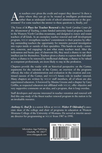 Are teachers ever given the credit and respect they deserve? Is there a place where they can go to be treated as intelligent professionals rather than as underpaid tools of school administrations or the government? For some teachers the answer to these questions is, finally, yes! The focus of A Place for Teacher Renewal is the North Carolina Center for the Advancement of Teaching, a state-funded university-based program, located in the Western North Carolina mountains, and designed to renew and retain teachers of all kinds. As an exemplary teacher renewal and staff development program, NCCAT strengthens teachers' commitment to their practice by offering outstanding teachers the opportunity for intensive personal investigation into topics inside or outside of their specialties. This hands-on study-extensive, concrete, and engaging-is just what many teachers need. After the tediousness and hectic pace of classroom life, they need a chance to use their intellect just for themselves. Teachers given a chance to express their full adult selves, a chance to be renewed by intellectual challenge, a chance to be valued as competent professionals, are more likely to stay in the profession. Chapters provide the reader with an historical perspective on the Center, arguments for the rationale of the Center, an overview of the programs offered, the roles of administration and evaluation in the creation and continued success of the Center, and NCCAT's future role in teacher renewal. Many chapters are written by NCCAT staff members, all of whom are also experienced educators. A foreword by Maxine Greene and a chapter by Gary Griffin, as respected educators not affiliated with NCCAT, offer objective and very supportive comments on an idea, and a program, that is long overdue. Staff developers and anyone interested in teacher retention and renewal will find this case study of the finest teacher renewal program in the nation to be an invaluable resource. Anthony G. Rud Jr. is a senior fellow at NCCAT. Walter P. Oldendorf is associate dean of the college and chair of programs in education at Western Montana College of the University of Montana. He served as interim associate director for programming at NCCAT from 1987 to 1990.