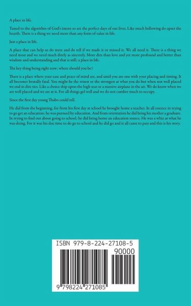 A place in life. Tuned to the algorithm of God's intent so are the perfect days of our lives. Like much bellowing do upset the hearth. There is a thing we need more than any form of value in life. Just a place in life. A place that can help us do mete and do tell if we made it or missed it. We all need it. There is a thing we need most and we need much direly as sincerely. More dire than love and yet more profound and better than wisdom and understanding and that is still; a place in life. The key thing being right now; where should you be? There is a place where your ease and peace of mind are, and until you are one with your placing and timing. It all becomes brutally fatal. You might be the wisest or the strongest at what you do but when not well placed we end in dire ties. Like a choice ship upon the high seas or a massive airplane in the air. We do know when we are well placed and we are at it. For all things gel well and we do not cumber much to occupy. Since the first day young Thabo could tell. He did from the beginning, for from his first day at school he brought home a teacher. In all essence in trying to go get an education; he was pursued by education. And from orientation he did bring his mother a graduate. In trying to find out about going to school; he did bring home an education source. He was a whiz at what he was doing. For it was his due time to do go to school and he did go and it all came to pass and this is his story.