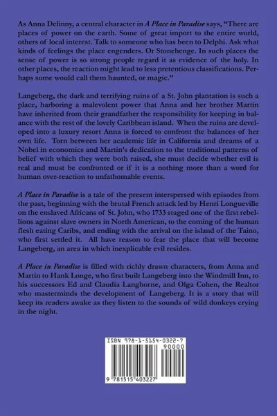 As Anna Delinny, a central character in A Place in Paradise says, "There are places of power on the earth. Some of great import to the entire world, others of local interest. Talk to someone who has been to Delphi. Ask what kinds of feelings the place engenders. Or Stonehenge. In such places the sense of power is so strong people regard it as evidence of the holy. In other places, the reaction might lead to less pretentious classifications. Perhaps some would call them haunted, or magic." Langeberg, the dark and terrifying ruins of a St. John plantation is such a place, harboring a malevolent power that Anna and her brother Martin have inherited from their grandfather the responsibility for keeping in balance with the rest of the lovely Caribbean island. When the ruins are developed into a luxury resort Anna is forced to confront the balances of her own life. Torn between her academic life in California and dreams of a Nobel in economics and Martin's dedication to the traditional patterns of belief with which they were both raised, she must decide whether evil is real and must be confronted or if it is a nothing more than a word for human over-reaction to unfathomable events. A Place in Paradise is a tale of the present interspersed with episodes from the past, beginning with the brutal French attack led by Henri Longueville on the enslaved Africans of St. John, who 1733 staged one of the first rebellions against slave owners in North American, to the coming of the human flesh eating Caribs, and ending with the arrival on the island of the Taino, who first settled it. All have reason to fear the place that will become Langeberg, an area in which inexplicable evil resides. A Place in Paradise is filled with richly drawn characters, from Anna and Martin to Hank Longe, who first built Langeberg into the Windmill Inn, to his successors Ed and Claudia Langhorne, and Olga Cohen, the Realtor who masterminds the development of Langeberg. It is a story that will keep its readers awake as they listen to the sounds of wild donkeys crying in the night.