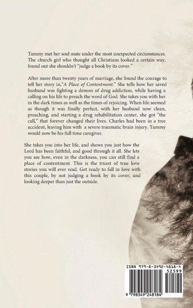 Tammy met her soul mate under the most unexpected circumstances. The church girl who thought all Christians looked a certain way, found out she shouldn't "judge a book by its cover." After more than twenty years of marriage, she found the courage to tell her story in, "A Place of Contentment." She tells how her saved husband was fighting a demon of drug addiction, while having a calling on his life to preach the word of God. She takes you with her in the dark times as well as the times of rejoicing. When life seemed as though it was finally perfect, with her husband now clean, preaching, and starting a drug rehabilitation center, she got "the call," that forever changed their lives. Charles had been in a tree accident, leaving him with a severe traumatic brain injury. Tammy would now be his full time caregiver. She takes you into her life, and shows you just how the Lord has been faithful, and good through it all. She lets you see how, even in the darkness, you can still find a place of contentment. This is the truest of true love stories you will ever read. Get ready to fall in love with this couple, by not judging a book by its cover, and looking deeper than just the outside.