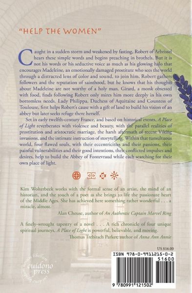 "Help the women." Caught in a storm and weakened by fasting, Robert of Arbrissel hears these simple words and begins preaching in brothels. But it is not his words or his seductive voice as much as his glowing halo that encourages Madeleine, an emotionally damaged prostitute who sees the world through a distracted lens of color and sound, to join him. Robert gathers followers and the reputation of sainthood, but he knows that his thoughts about Madeleine are not worthy of a holy man. Girard, a monk obsessed with food, finds following Robert only mires him more deeply in his own bottomless needs. Lady Philippa, Duchess of Aquitaine and Countess of Toulouse, first helps Robert's cause with a gift of land to build his vision of an abbey but later seeks refuge there herself. Set in early twelfth-century France, and based on historical events, A Place of Light reverberates with violence and beauty, with the parallel realities of prostitution and aristocratic marriage, the harsh aftermath of recent Viking invasions, and the intimate instruction of storytelling. Within that tumultuous world, four flawed souls, with their eccentricities and their passions, their painful vulnerabilities and their good intentions, their conflicted impulses and desires, help to build the Abbey of Fontevraud while each searching for their own place of light.