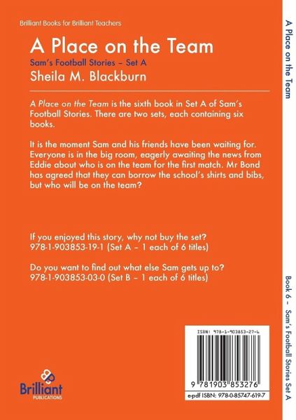 It is the moment Sam and his friends have been waiting for. Everyone is in the big room, eagerly awaiting the news from Eddie about who is on the team for the first match. Mr Bond has agreed that they can borrow the school¿s shirts and bibs, but who will be on the team? A Place on the Team is the sixth book in Set A of Sam¿s Football Stories. There are two sets, A and B, each containing six books.