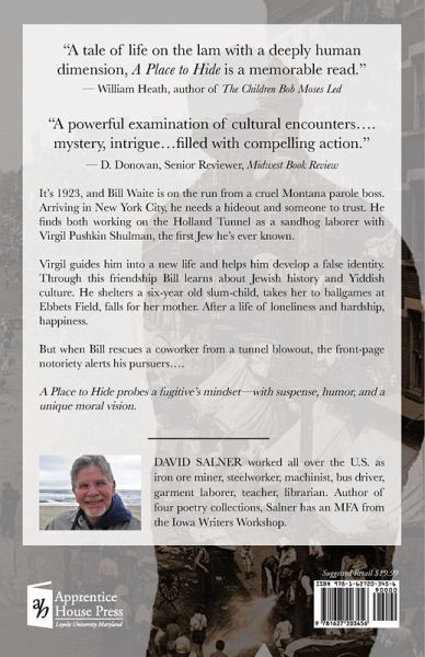 It's 1923, and Bill Waite is on the run from a cruel Montana parole boss. Arriving in New York City, he needs a hideout and someone to trust. He finds both working on the Holland Tunnel as a sandhog laborer with Virgil Pushkin Shulman, the first Jew he's ever known. Virgil guides him into a new life and helps him develop a false identity. Through this friendship Bill learns about Jewish history and Yiddish culture. He shelters a six-year old slum-child, takes her to ballgames at Ebbets Field, falls for her mother. After a life of loneliness and hardship, happiness. But when Bill rescues a coworker from a tunnel blowout, the front-page notoriety alerts his pursuers.... A Place to Hide probes a fugitive's mindset-with suspense, humor, and a unique moral vision.