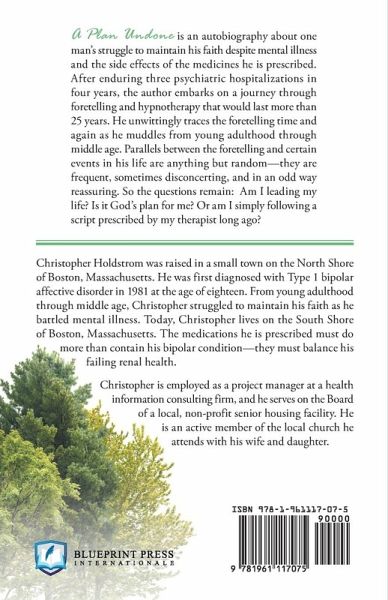 A Plan Undone is an autobiography about one man's struggle to maintain his faith despite mental illness and the side effects of the medicines he is prescribed. After enduring three psychiatric hospitalizations in four years, the author embarks on a journey through foretelling and hypnotherapy that would last more than 25 years. He unwittingly traces the foretelling time and again as he muddles from young adulthood through middle age. Parallels between the foretelling and certain events in his life are anything but random-they are frequent, sometimes disconcerting, and in an odd way reassuring. So the questions remain: Am I leading my life? Is it God's plan for me? Or am I simply following a script prescribed by my therapist long ago? Christopher Holdstrom was raised in a small town on the North Shore of Boston, Massachusetts. He was first diagnosed with Type 1 bipolar affective disorder in 1981 at the age of eighteen. From young adulthood through middle age, Christopher struggled to maintain his faith as he battled mental illness. Today, Christopher lives on the South Shore of Boston, Massachusetts. The medications he is prescribed must do more than contain his bipolar condition-they must balance his failing renal health. Christopher is employed as a project manager at a health information consulting firm, and he serves on the Board of a local, non-profit senior housing facility. He is an active member of the local church he attends with his wife and daughter.