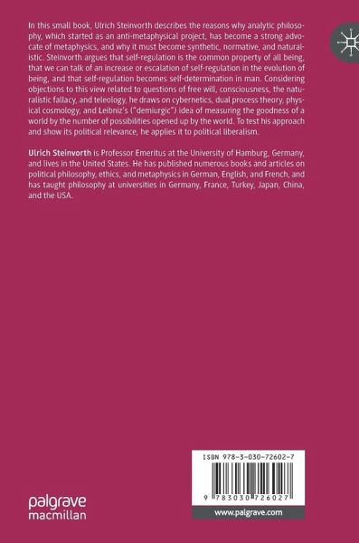 In this small book, Ulrich Steinvorth describes the reasons why analytic philosophy, which started as an anti-metaphysical project, has become a strong advocate of metaphysics, and why it must become synthetic, normative, and naturalistic. Steinvorth argues that self-regulation is the common property of all being, that we can talk of an increase or escalation of self-regulation in the evolution of being, and that self-regulation becomes self-determination in man. Considering objections to this view related to questions of free will, consciousness, the naturalistic fallacy, and teleology, he draws on cybernetics, dual process theory, physical cosmology, and Leibniz's ("demiurgic") idea of measuring the goodness of a world by the number of possibilities opened up by the world. To test his approach and show its political relevance, he applies it to political liberalism.