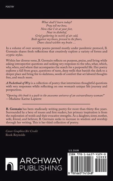 "A pocketbook of wry" is a third collection of poems from prolific poet/writer B. Germain. This set of 77 poems written under mostly pandemic protocol represents exploration both away from and back to rhyme - in new forms and cryptic styles. The themes of the book center always on purpose, praise and living out the philosophies of our personal preferences - as B. Germain interrogates in almost every poem - the who, whom, what, which, why, when, where and how of a purposeful life.