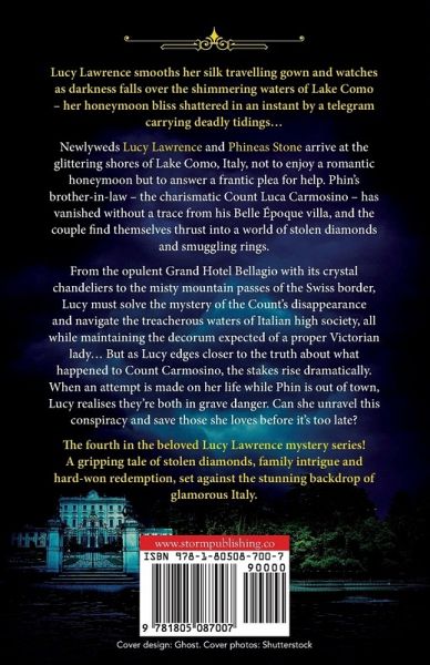 Lucy Lawrence smoothed her silk travelling gown and watched as darkness fell over the shimmering waters of Lake Como - her honeymoon bliss shattered in an instant by a telegram carrying deadly tidings... Newlyweds Lucy Lawrence and Phineas Stone arrive at the glittering shores of Lake Como, Italy, not to enjoy a romantic honeymoon but to answer a frantic plea for help. Phin's brother-in-law - the charismatic Count Luca Carmosino - has vanished without a trace from his Belle Époque villa, and the couple find themselves thrust into a world of stolen diamonds and smuggling rings. From the opulent Grand Hotel Bellagio with its crystal chandeliers to the misty mountain passes of the Swiss border, Lucy must solve the mystery of the Count's disappearance and navigate the treacherous waters of Italian high society, all while maintaining the decorum expected of a proper Victorian lady... But as Lucy edges closer to the truth about what happened to Count Carmosino, the stakes rise dramatically. When an attempt is made on her life while Phin is out of town, Lucy realizes they're both in grave danger. Can she unravel this conspiracy and save those she loves before it's too late? The fourth in the beloved Lucy Lawrence mystery series! A gripping tale of stolen diamonds, family intrigue, and hard-won redemption set against the stunning backdrop of glamorous Italy.