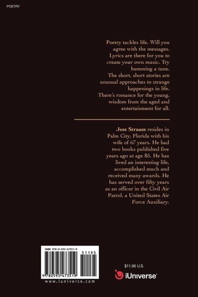 Poetry tackles life. Will you agree with the messages. Lyrics are there for you to create your own music. Try humming a tune. The short, short stories are unusual approaches to strange happenings in life. There's romance for the young, wisdom from the aged and entertainment for all.