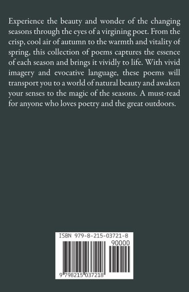 Experience the beauty and wonder of the changing seasons through the eyes of a virgining poet. From the crisp, cool air of autumn to the warmth and vitality of spring, this collection of poems captures the essence of each season and brings it vividly to life. With vivid imagery and evocative language, these poems will transport you to a world of natural beauty and awaken your senses to the magic of the seasons. A must-read for anyone who loves poetry and the great outdoors.