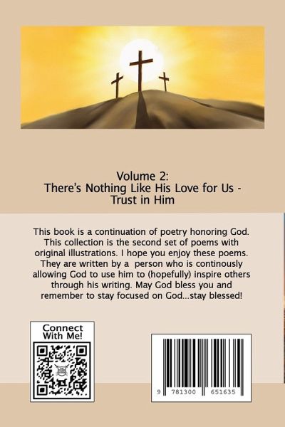 This book is a continuation of poetry honoring God. This collection is the second set of poems with original illustrations. I hope you enjoy these poems. They are written by a person who is continously allowing God to use him to (hopefully) inspire others through his writing. May God bless you and remember to stay focused on God...stay blessed!