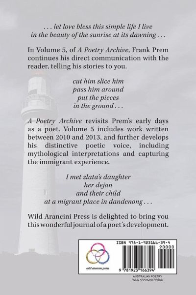 . . . let love bless this simple life I live in the beauty of the sunrise at its dawning . . . ~ In Volume 5, of A Poetry Archive, Frank Prem continues his direct communication with the reader, telling his stories to you. ~ cut him slice him pass him around put the pieces in the ground . . . ~ A Poetry Archive revisits Prem's early days as a poet. Volume 5 includes work written between 2010 and 2013, and further develops his distinctive poetic voice, including mythological interpretations and capturing the immigrant experience. ~ I met zlata's daughter her dejan and their child at a migrant place in dandenong . . . ~ Wild Arancini Press is delighted to bring you this wonderful journal of a poet's development.