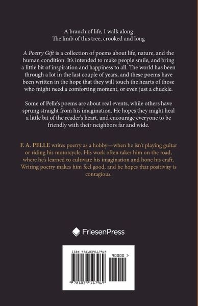 A branch of life, I walk along The limb of this tree, crooked and long A Poetry Gift is a collection of poems about life, nature, and the human condition. It's intended to make people smile, and bring a little bit of inspiration and happiness to all. The world has been through a lot in the last couple of years, and these poems have been written in the hope that they will touch the hearts of those who might need a comforting moment, or even just a chuckle. Some of Pelle's poems are about real events, while others have sprung straight from his imagination. He hopes they might heal a little bit of the reader's heart, and encourage everyone to be friendly with their neighbors far and wide.
