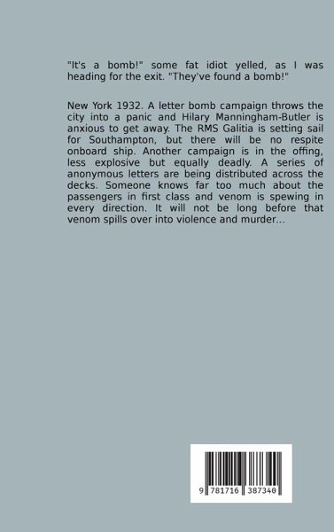 "It's a bomb!" some fat idiot yelled, as I was heading for the exit. "They've found a bomb!" New York 1932. A letter bomb campaign throws the city into a panic and Hilary Manningham-Butler is anxious to get away. The RMS Galitia is setting sail for Southampton, but there will be no respite onboard ship. Another campaign is in the offing, less explosive but equally deadly. A series of anonymous letters are being distributed across the decks. Someone knows far too much about the passengers in first class and venom is spewing in every direction. It will not be long before that venom spills over into violence and murder...