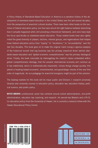 A Policy History of Standards-Based Education in America is a narrative history of the development of standards-based education in the United States over the last several decades, from the perspective of anarchist cultural studies. There have been other books on the evolution of federal education policy, but few have struck the right balance between describing how it actually happened while still providing a theoretical framework, and none have kept the focus specifically on standards-based education. These related books have also rightly noted the great diversity of players, factions, interest groups, and organizations that helped move federal education policy from «equity», to «excellence», to «accountability» over the last four decades. This book goes on to make the original claim (using a rigorous analysis of the historical record) that big business was the primary empirical driver behind standards-based education and «global economic competitiveness» was the primary ideological driver. Finally, the book concludes by interrogating the implicit claims embedded within global competitiveness ideology; that the present international economy will continue as it has indefinitely, which is mathematically impossible. Unless things change quickly, this planet is heading toward economic, environmental, and geostrategic shocks of the very first order of magnitude. An eco-pedagogy for anarchist bioregions might be part of the solution.
