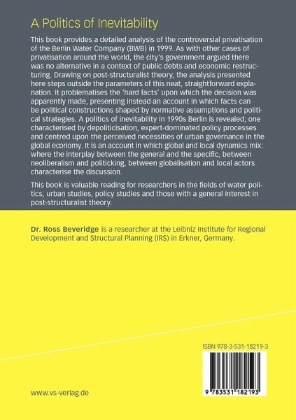 This book provides a detailed analysis of the controversial privatisation of the Berlin Water Company (BWB) in 1999. As with other cases of privatisation around the world, the city's government argued there was no alternative in a context of public debts and economic restructuring. Drawing on post-structuralist theory, the analysis presented here steps outside the parameters of this neat, straightforward explanation. It problematises the 'hard facts' upon which the decision was apparently made, presenting instead an account in which facts can be political constructions shaped by normative assumptions and political strategies. A politics of inevitability in 1990s Berlin is revealed; one characterised by depoliticisation, expert-dominated policy processes and centred upon the perceived necessities of urban governance in the global economy. It is an account in which global and local dynamics mix: where the interplay between the general and the specific, between neoliberalism and politicking, and between globalisation and local actors characterise the discussion.