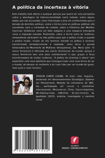 Este trabalho está aberto a qualquer pessoa que queira ter uma perspetiva sobre a abordagem da interseccionalidade como método; sobre alguns dados que são assumidos como informação e esta em conhecimento para a tomada de decisões políticas, sobre a forma como as políticas públicas são concebidas para a sociedade do cuidado, sobre a influência das Medidas Coercivas Unilaterais como um fator exógeno e uma categoria emergente como a migração induzida. Finalmente, sobre a forma como as mulheres venezuelanas participam na vida política para que a política mude; e quando a política mudar, muitas de nós teremos entrado na política e teremos transformado verdadeiramente a realidade, como disse a grande historiadora do Movimento de Mulheres Venezuelanas, Dip. María León: "O nosso feminismo é diferente dos outros feminismos do mundo, porque o nosso feminismo tem uma base constitucional" e que, graças à força transformadora de muitas mulheres, "A política da incerteza à vitória" vem especificar uma nova episteme que consegue trazer uma nova forma de ver o mundo, de abraçar as mulheres e as suas lutas por um mundo de iguais, mais justo e mais humano.