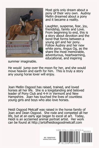 Most girls only dream about a pony of their very own. Audrey Mellin dreamed about a pony and it became a reality. Laughter, suspense, fear, joy, friendship, family and Love. From beginning to end, this is a story about devotion and the bond that forms between a young girl and her pony. Follow Audrey and her new white pony, Angus Og, as the share the most memorable, adventurous, heartwarming, educational, and inspiring summer imaginable. He would jump over the moon for her, and she would move heaven and earth for him. This is truly a story any horse lover will enjoy.