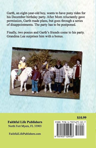 Garth, an eight year-old boy, wants to have pony rides for his December birthday party. After Mom reluctantly gave permission, Garth made plans, but goes through a series of disappointments. The party has to be postponed. Finally, two ponies and Garth's friends come to his party. Grandma Lee surprises him with a bonus.